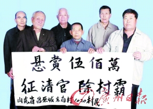 日前,山東昌樂縣城關街辦東南村6名村民在天涯論壇上發帖《懸賞五百萬 征清官 除村霸》,帖子稱,2000年本村村民因不滿村委20年的財務賬目不公開,要求清查村賬,經過半年的清賬和查證,發現以村支書卞長智為首的村官們侵占集體資金和財產5000多萬元的犯罪事實。但多年的上告均未有具體處理結果,他們稱希望“征清官 除村霸”,誰能幫助他們討回5000萬集體資產,愿意提供500萬懸賞,還稱是得到了1020名村民簽名允許。對此,東南村委工作人員回應稱“這是誣告”。