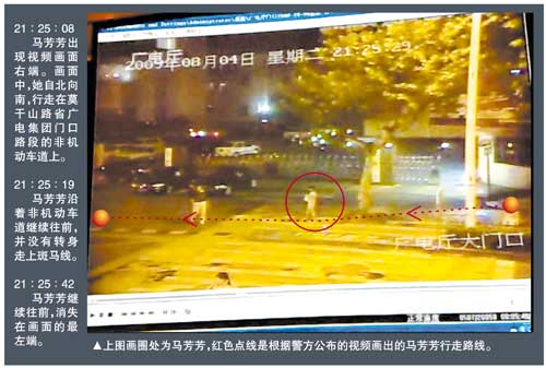 發布會上,公安機關還公布了車禍當晚監控視頻資料。根據案情通報,該起交通肇事案被害人馬芳芳是在橫穿馬路時距斑馬線南側10米左右處被肇事車撞上身亡,當時,她并沒有走斑馬線。