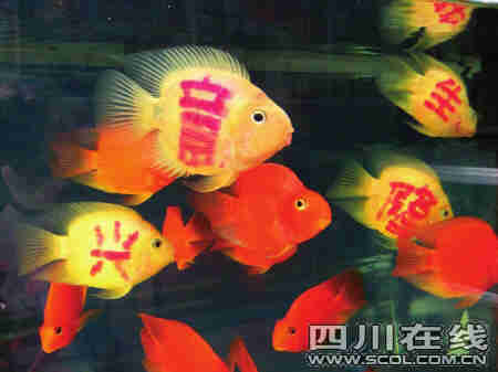 “咦,老板,你這個魚身上還有字啊?”昨日上午,市民李先生在成都青石橋?qū)櫸锸袌鲆患宜屦^內(nèi),發(fā)現(xiàn)4條白色觀賞魚的身上分別寫著“生”、“意”、“興”、“隆”,4個字組成了一幅活動的紅字喜聯(lián)。原來,這些圖案是在魚還是幼小時,用激光打在其身上的,不會掉色。“文身魚”作為禮品受到不少市民追捧,但也有市民提出質(zhì)疑。