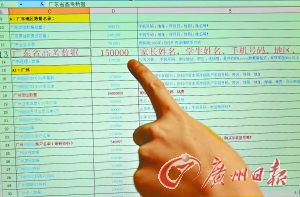在這份數據庫中,記者發現了一份15萬人的廣東高考數據,包括家長和學生姓名、手機號碼等。群發公司工作人員表示,這個數據是今年最新的,并且暗示“現在剛開學,對學生家長發‘銀行轉賬類’的挺合適”。