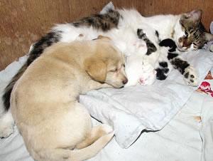 昨天上午10點多,記者在南京下關水關橋一戶居民家看到了一件新鮮事,一只剛剛產下幾只貓寶寶的大花貓,竟然認養了一只小狗崽做“義子”。