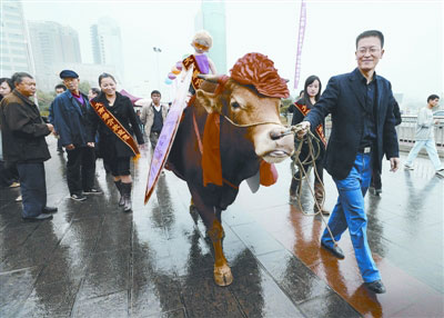 昨日中午,一男子在貴陽市人民廣場上演獨特的征婚秀,將一頭800斤重的公牛作為道具為其征婚造勢。事主黃先生自稱,這是貴陽最“牛”的征婚儀式。