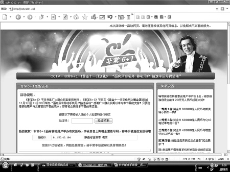 記者在“輸入驗證碼”一欄中輸入了張小姐收到短信上的驗證碼3358后,便看到中獎信息:您是本次活動二等獎用戶,您將獲得“非常6+1欄目”送出的驚喜獎金¥60000元及三星Q40筆記本電腦一部。頁面下方有“非常6+1”的全國唯一客服電話400-6151-211。撥通該電話后,記者表示自己就是中獎者,一位男子提示記者先要填寫個人資料,填寫后按照網站提示把手續費匯到相關賬號才能領到獎品。