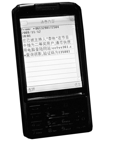 “您已被主持人李詠在節目中抽為二等獎用戶,請盡快使用電腦登陸網站cctvs361.cn查詢領取,驗證碼為3588。”收到這條短信,沉浸在喜悅里的陜西西安市民張女士并沒有意識到,自己已經掉進了一場中獎騙局。