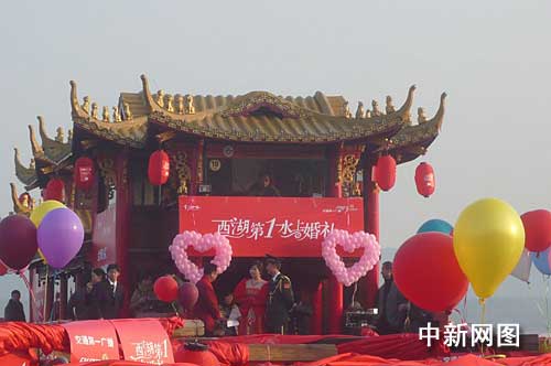 中新網杭州11月22日電(記者 柴燕菲 實習生 倪幼杰)今天下午,西湖上舉行了一場獨特而浪漫的水上婚禮。這是在西湖上迎來的第一對新人。更為特殊的是,婚禮的新郎是剛剛參加了國慶六十周年閱兵的戰士。