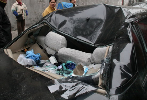 車后部被完全壓壞。王豐/攝