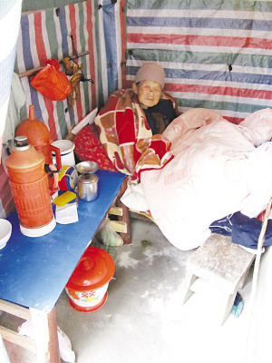 在老人居住的院子里,記者見到了老人的孫女小湯,望著奶奶蝸居在一間柴房里,小湯其實心里也是不情愿,可無奈家里的條件實在太差了,把奶奶安頓在那里也是無奈之舉。小湯告訴記者,奶奶叫章云秀,今年90歲,從2009年11月份開始就一直住在這個小棚子里。“這個棚子原來是我們家的柴房,后來父親把它整理了一下就給奶奶住了。”小湯說,他們一家都是從安徽無為到南京來打工的,他的父親在家中排行老小,上面還有4個姐姐和1個哥哥。聽長輩說,爺爺在1958年就去世了,可以說是奶奶一個人將6個孩子撫養(yǎng)成人。前年奶奶因為一起小車禍臥床不起,渾身都痛,作為老人的兒子,小湯的父親湯先平就和哥哥輪換著服侍老人,今年輪到了小湯的父親,可是家里四口人住在2間房子里,她和姐姐睡一張床,父母睡一張,實在沒地方再擺下奶奶的床了,這才將老人安頓在柴房中,但是老人的一日三餐都是他們家照樣供應(yīng),從來也沒有少過。然而,可憐老太遭遇的一位鄰居卻告訴記者,在11月搬到這個窩棚里之前,老人有幾天是睡在兒子家堂屋的沙發(fā)上。“睡沙發(fā)上也比睡外面強(qiáng)啊!”