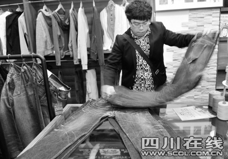 前日下午,“養(yǎng)牛人”之一的“豪豬”穿著一條已經(jīng)“養(yǎng)”了兩年的牛仔褲從北京回到成都。作為成都“養(yǎng)牛”的先驅(qū)者,27歲的他已經(jīng)“養(yǎng)牛”3年,現(xiàn)在手中有7條“牛”。說起自己的“牛”,“豪豬”立即搬出了4條牛仔褲。“這條是‘養(yǎng)了’3個(gè)月的,這條半年。”豪豬說,“接下來這條一年,最后就是兩年的。”豪豬拿起“養(yǎng)”了一年的褲子,褲子后袋部位上一個(gè)T字形十分明顯。這個(gè)是他在其他牛友的啟迪下,將一個(gè)小方盒裝在后袋內(nèi)一個(gè)月磨出來的。“還能塞貓爪形狀的玩具,花紋酷酷的ZIPPO打火機(jī),很Q吧?”
