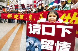 動物保護者高舉拒吃貓狗的條幅。