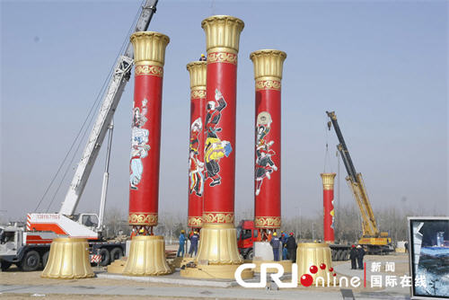 圖為奧林匹克公園里,工人們正在安裝民族團結柱 (圖片來源:國際在線)