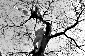 10分鐘后,石景山銀河消防中隊、派出所民警先后趕到,看到一名頭戴皮帽的老年男子坐在樹叉上,離地面約10米高,雙手抱住一根直徑不足15厘米的樹枝。樹上垂下一條紅色條幅。