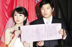 1月30日下午,一場浪漫的婚禮正在進行。新郎孟慶生與新娘白媛面對自己的父母與親友,鄭重地宣讀了他們的“結婚誓言”。還把它寫在“婚書”上,并認真地將雙方的私人印章加蓋在“婚書”上。同時,雙方的父母和他們的證婚人也將自己的印章加蓋上去,一枚枚雕刻精美的印章也成為這場婚禮上別致的道具和永遠留存的紀念品。