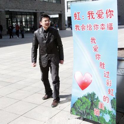 這捧愛的玫瑰是在昨日上午11時(shí)許出現(xiàn)在軟件園16號(hào)樓天井廣場(chǎng)內(nèi)的,一張一人多高的POP海報(bào)書寫著愛的誓言:“虹:我愛你,我會(huì)給你幸福”、“我愛你勝過彩虹的美麗”。求愛的男青年站在海報(bào)旁,他說希望他所愛的虹透過辦公室明亮的玻璃窗看到他的時(shí)候,能夠立刻來到他的面前,然而他等了半個(gè)小時(shí)也沒見到虹,而是樓上樓下、樓內(nèi)樓外數(shù)百雙好奇的眼睛。記者聽到了很多猜測(cè)的聲音,“這么長(zhǎng)時(shí)間沒出現(xiàn),說不定人家已經(jīng)決定拒絕了。”“太興師動(dòng)眾了,全公司的人都看著,換作我還真有些不好意思出來呢。”“要是我的男朋友,我希望他坐著熱氣球來跟我求愛。”“讓我們慢慢等待,沒準(zhǔn)就會(huì)出現(xiàn)出其不意的浪漫。”