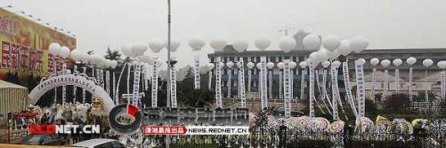 白色的氣拱門、白色的升空大氫氣球,氣球下掛著白底黑字的長條幅,條幅上是一幅幅挽聯……如此熱鬧的陣勢,并不是拍攝電影的場面,帖子說據稱是衡陽某房地產商母親去世的宏大祭奠場面,是在華新開發區立交橋旁拍的,并感慨說,“看看人家這排場,才知道大操大辦是什么概念!”