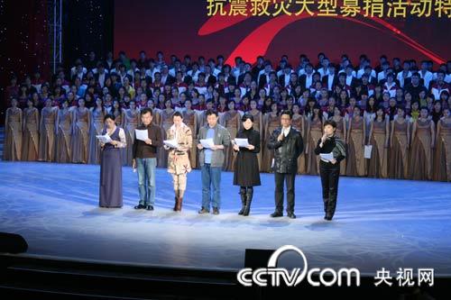 央視知名主持人周濤、朱軍、董卿、張澤群將作主持、采訪人;白巖松、李瑞英作新聞連線人;李詠、畢福劍、馬東、朱迅、任魯豫、崔永元、王小丫、撒貝寧、鞠萍、韓喬生、董浩、歐陽夏丹、李梓萌、胡蝶、魯健等50人擔任現場捐助熱線電話接線員。