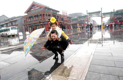 4月22日,北京又迎來一場春雨。圖為在前門大街游玩的一對母女。