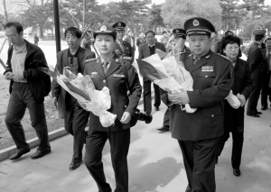 毛岸英烈士的妻子劉松林和女兒楊密緩慢地行進在墓群中,向烈士墓一一鮮花鞠躬。劉松林的眼淚一直灑個不停!拔胰ミ^朝鮮掃墓,也來過沈陽烈士陵園,但是每次來心情都特別難過。這些烈士都是母親的兒子、妻子的丈夫、孩子的父親,卻為國家的安危獻出了年輕的生命,后人是要永遠緬懷他們的!眲⑺闪衷诔r跪拜了兩位烈士,一位是毛岸英,一位是邱少云,“他們?yōu)閲柢|的精神值得我敬佩,尤其是邱少云烈士烈火焚身一動不動,那是需要有超人的毅力的,我由衷地敬佩他。在他們面前,我真地有一種沖動,我沒有資格站著紀念他們,只有跪拜才足以表達敬仰之心!眲⑺闪謺r常寫些隨筆,唯獨寫到這段時擱了筆,淚水難以抑制,“不過我還是要堅強地寫下來,教育我們的后輩,不要忘記烈士,我們今天的幸福生活都是他們用鮮血換來的。我告訴孩子們,做人要正直,辦事要拍良心,要無愧于祖國和人民。”
