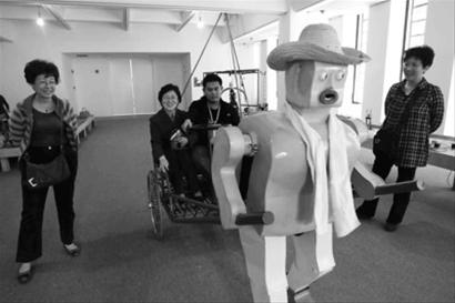 外灘美術館3樓,吳玉祿的“機器人工廠”占了整層。拉車的、打鼓的、翻墻的,狗,老鼠,瓢蟲……這些機器人都姓吳,“吳老大”誕生于1986年,現在確切排到吳老四十幾,老吳自己也搞不清楚。拉洋車的“吳老32”能說話:“我是拉洋車機器人,吳玉祿是我爹,我拉我爹去逛街,謝謝。”這些機器人有著濃濃的鄉土氣息,材料大部分來自廢品收購站,因此外表怪模怪樣。
