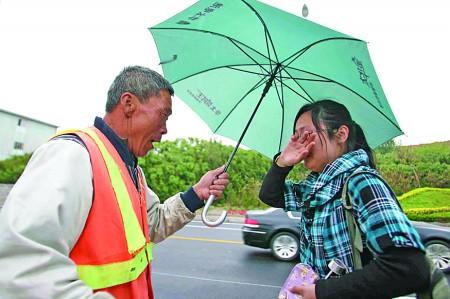 雨中的張國順已經等了2個小時,為什么要等?他這樣說:“已經找到錢包主人了,就等等吧。”樸實的話語,讓人感動。可張國順為張娜娜撐起雨傘的瞬間更讓人感動。我們猜想,如父親般和藹的老張也許也有一個這么大的女兒,他安慰呵護著她,這分感動讓人難忘。