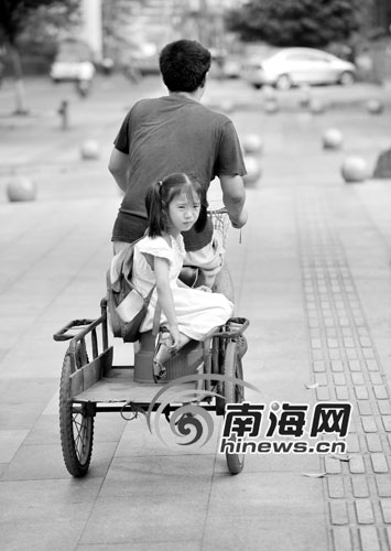 5月24日,南國(guó)都市報(bào)11版刊登的一張圖片吸引了不少市民的關(guān)注:女孩蹲在破舊的三輪車(chē)上,用手指比劃著做算術(shù)。父親蹲在三輪車(chē)旁,慈愛(ài)地看著女兒。這溫馨的一幕感動(dòng)了眾多讀者和網(wǎng)友。網(wǎng)友木木留言,“大大的世界也許對(duì)這位父親而言有些難以理解,可與生俱來(lái)的父愛(ài),讓他知道愛(ài)女兒是應(yīng)該的,眼中的溫柔打動(dòng)著周?chē)娜恕8概異?ài),在這一刻悄然傳遞……”這是怎樣的一對(duì)父女?25日,記者走進(jìn)了他們的家。