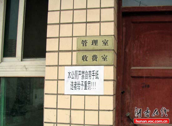 據了解,此公廁位于武漢市武昌區某建材市場內。張先生說,他是中午去建材市場幫單位買點東西,無意間發現了這條“雷人”的標語警告,于是拍了照。在這個公廁上廁所每人每次五角,手紙另外收費三角。