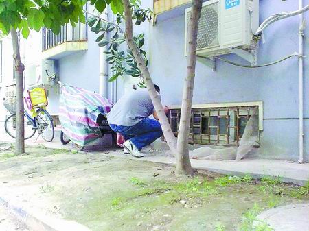 該樓上的一居民說,那名男子就在樓洞口東側不遠處的地下室。順著該居民手指的方向,記者找到了那個地下室窗戶,窗戶緊挨地面,一中年男子正蹲著對地下室內的男子勸說,但沒有任何回應。