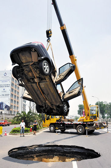 上周五,陷入南昌街頭塌陷路面上的小轎車被吊離現(xiàn)場 新華社 發(fā)
