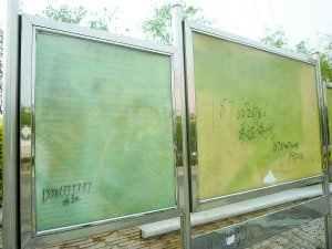 6月2日,記者來到萬豐公園。走到正門口,遠遠地望見在大理石上鐫刻著“萬豐公園”四個大字,圓形廣場中央矗立著12根“生肖柱”,十分氣派。但走近一看卻發現大理石門邊的臺階上散落著很多瓜子皮、飲料瓶等垃圾。3塊涂寫著“辦證”等小廣告的牌子,原來是公園的介紹和游覽圖,但字跡模糊難辨。