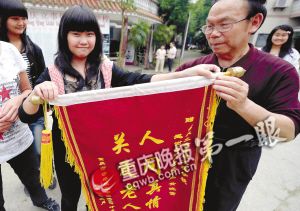 學(xué)校校長(zhǎng)將老人家屬送來(lái)的錦旗轉(zhuǎn)交給小黃。冉文攝(圖片來(lái)源:重慶晚報(bào))