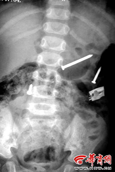 來自榆林市米脂縣的這名一歲半女孩,在最近一個多月內,從體內不斷排出鐵釘,共達20多枚。更為奇怪的是,在醫院拍片顯示體內已沒有鐵釘時,過幾天鐵釘還會出現。