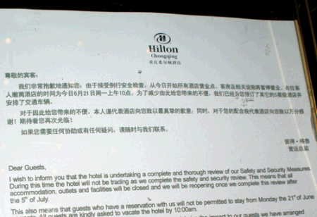 重慶市渝中區(qū)兩路口的希爾頓飯店,其大門緊閉謝客,希爾頓重慶營運總監(jiān)彼得。魯格(Peter Rugg)的致歉信被置于酒店門前。