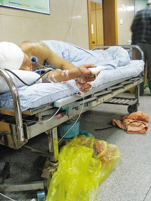 受傷的鄭某躺在病床上。