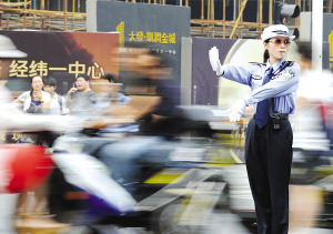 美麗女交警站在街頭指揮交通。范曉林 季宇軒 攝