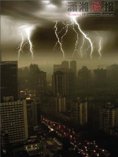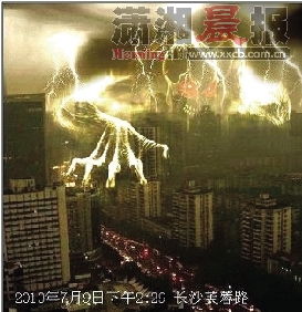 昨日下午2時(shí),一陣電閃雷鳴后,長(zhǎng)沙的天空頓時(shí)暗了下來(lái),傾盆大雨持續(xù)了一個(gè)多小時(shí)。隨后一張帶有“2010年7月9日下午2:40長(zhǎng)沙芙蓉路”字樣的圖片在貼吧里和各個(gè)QQ聊天群瘋狂轉(zhuǎn)載。