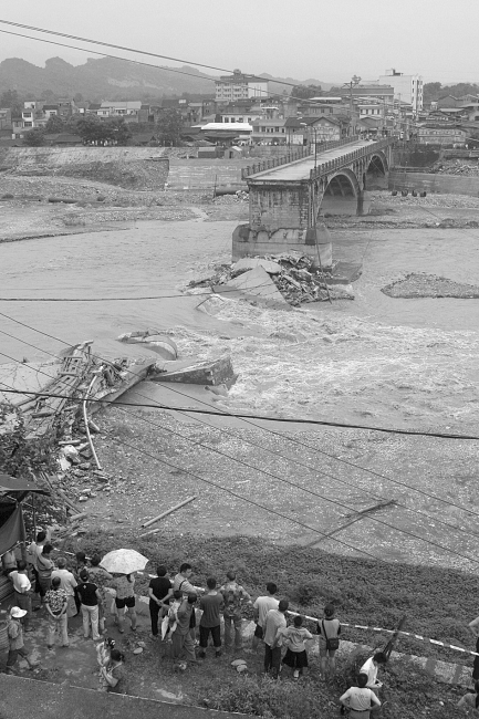 以河為界,右邊是新場鎮,左邊是老場鎮。以安昌河中心為界,黃土大橋靠左邊老場鎮的兩孔依然挺立著,而靠右邊新場鎮的兩孔則已垮塌。垮塌橋體部分,全部橫臥江中,橋墩翻頭。