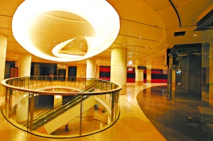 金光燦燦。這是記者走進國貿三期主樓的直觀印象:在挑高近8米的一層大廳,天花板灑下一排淺黃色的燈光,光亮的大理石地面上反射著深黃色的光;大廳呈“回”字形結構,中央是“口”字形排列的52部垂直的觀光電梯,電梯間內側的墻壁,全部是鋪滿金粉的紋飾,散發著雍容的氣息。