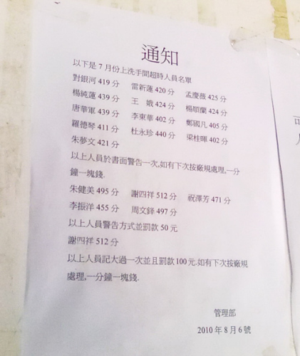 黃江友邦塑膠五金電器制品廠地處黃江板湖,是一家成立于1974年的港資企業,主要生產金屬禮品及家庭用品,約有員工三百余名。日前,該公司門衛處貼出了一張特殊的處罰通知。通知稱,謝四祥等18名員工因在7月份上洗手間超時受到不同程度的處罰,其中謝四祥的處罰最重,被記大過一次且罰款一百元。