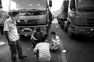 昨日下午6時(shí)許,京藏高速興和至懷安段進(jìn)京方向,一眼望不到邊際的大型貨車一動(dòng)不動(dòng)地停在路上,很多司機(jī)下車在路中間休息,高速路上有些小商販騎車或推車在路邊叫賣盒飯、方便面等。