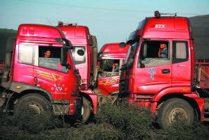 10點30分,記者驅車來到京藏高速張家口服務站1公里處,高速下的207國道被堵得嚴嚴實實,馬路上三條道排滿了運煤大貨車,記者停車翻越護欄來到橋下,腳踩之處,灰塵厚約3厘米。“前面就是萬全站,大貨限制上京藏高速!睋幻T師傅介紹,他的車上拉有39噸煤,19日從內蒙古東勝出發,經110國道,22日晚12時到達這條堵塞路段,“10多個小時,到現在也就前進了2公里。你往北走,后面堵了至少七八公里,后面還有更多煤車跟上來!
