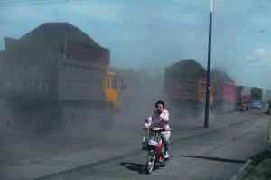 萬全縣境內的大貨車掀起的灰塵令行人呼吸困難。