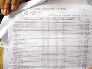 昨天下午,楊茂海在高港大泗鎮的家中,向記者出示了由高港人民醫院出具的賬單。指著其中一項“陰道分泌物檢查,1次,5元”,楊茂海情緒激動地稱,我爸爸是男的,“陰道分泌物檢查”從何而來。