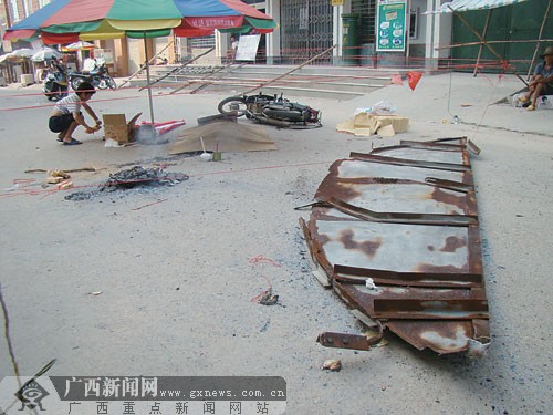 1日下午4時許,記者來到沙陂鎮街上,只見郵政儲蓄所沙陂營業廳門前停放著一具尸體,一張席子遮蓋在上面。旁邊有一塊鐵板和一輛翻倒的摩托車,地上擺放著紙錢、香等祭品。該廳的樓頂上安裝有一個信號發射塔,塔的周圍有幾個用鐵板做成的平臺,最下面那個大平臺缺了一塊鐵板。