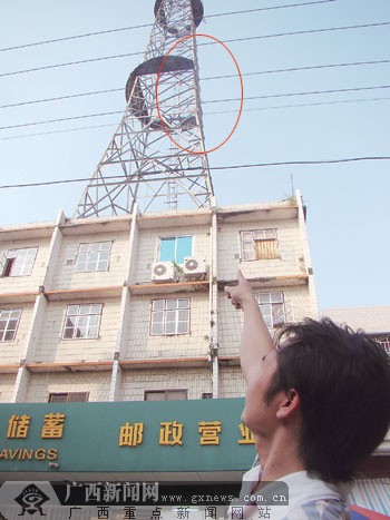 信號發射塔上的其中一個平臺缺了一部分(畫圈處)。記者 趙敏攝