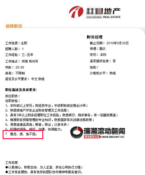 招聘單位為河南一家房地產(chǎn)公司,招聘職位為財務(wù)經(jīng)理,招聘截止日期為2010年9月30日。招聘廣告在“職位描述及具體要求”一項中列出七條要求,除了相關(guān)學歷、經(jīng)驗和個人素質(zhì)要求外,第七條就是被網(wǎng)友認為“很搞笑”的一項:“屬龍、虎、兔不招。”