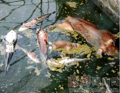 漂浮在魚塘里的死豬、死魚,發出陣陣惡臭