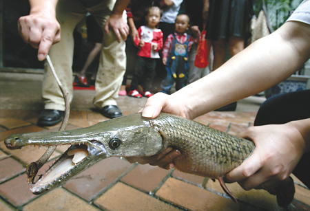 雀鱔來自北美或中美,目前生活于美國南部湖泊、中美等熱帶河流地區(qū),據(jù)報道,它最長可達6米,能吃下人類。由于雀鱔是一種食肉魚,食量大很兇猛,因此被列入世界十大兇猛淡水魚類之一,與食人魚齊名。不過雀鱔肉可以食用,但其卵有劇毒,一旦人誤食可能致命。(記者 王玨)