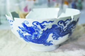 記者看到,那些康雍乾三朝的瓷器雖然圖案精美、做工高超,但精品上的一道道白色石膏線,如同一道道疤痕,顯得格外“刺眼”。原來,它們竟然是從3萬多塊殘破的瓷片中拼出來的。