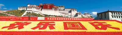 今天,西藏拉薩布達拉宮廣場上的“歡樂國慶”花壇五彩繽紛(見圖)。紅燈籠、鮮花、標語把古老的拉薩裝扮一新。(記者王明浩、孟海鷹、何勇、羅昌愛、羅艾樺)