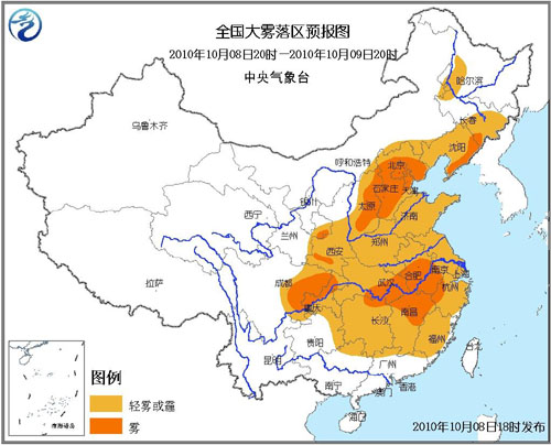 在7日下午江南一帶出現零星雨水之后,8日早晨出現霧的地方明顯增多,從吉林東南部、遼寧大部經過河北、一直到貴州、湖南、廣西東部和廣東西部都籠罩在輕霧當中。其中河北中東部、東北南部、蘇皖南部、湖北東南部、重慶西南部、湖南北部、江西北部、浙江北部等地部分地區能見度不足100米。