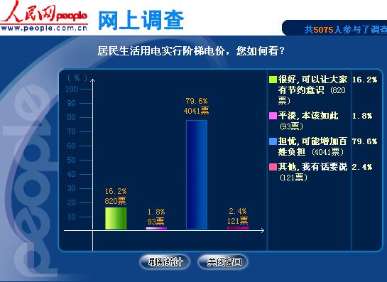 截至9日22時(shí)共5075人參與了調(diào)查,其中79.6%共4041名網(wǎng)友表示“擔(dān)憂,可能增加百姓負(fù)擔(dān)”;16.2%的網(wǎng)友,共820人表示“很好,可以讓大家有節(jié)約意識(shí)”;還有93名網(wǎng)友表示“平淡,本該如此”;最后,還有2.4%共121名網(wǎng)友表示“其他,我有話要說”。
